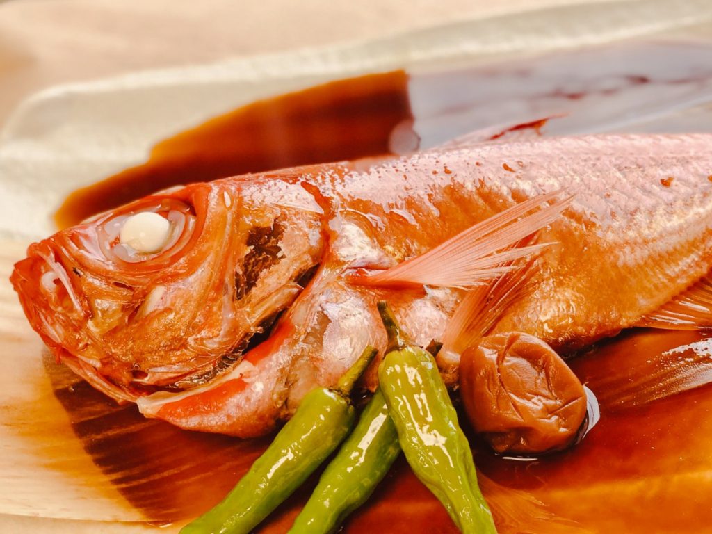 金目鯛の煮付けに梅干しを入れるのは伊豆スタイル。梅干しを入れるのことでフルーティさが出て、絶妙のバランスを生み出し、タレの濃さだけはない味の奥行きを演出してくれます。